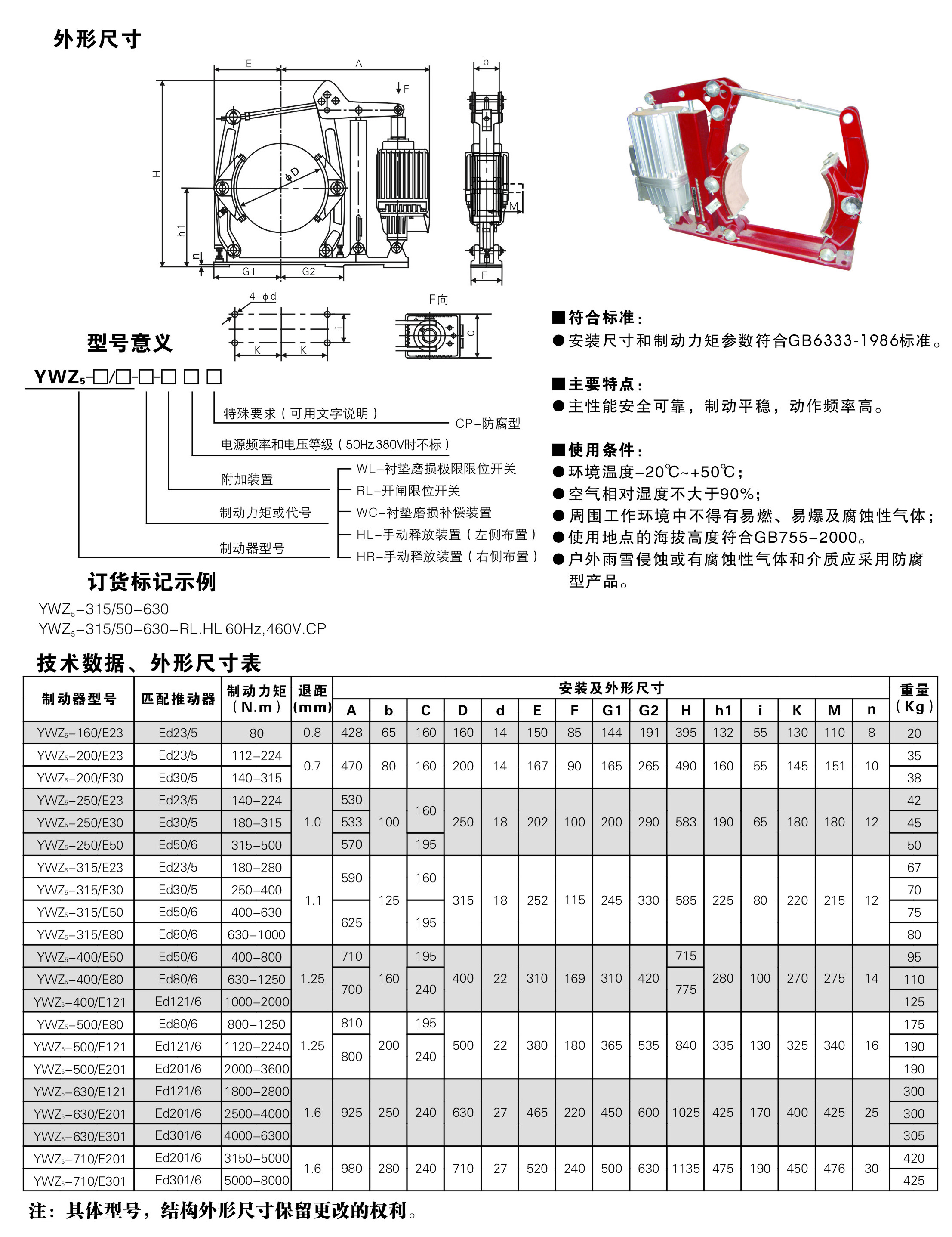 產(chǎn)品型號:YWZ5-160/23,YWZ5-200/23,YWZ5-200/30,YWZ5-250/23,YWZ5-250/30,YWZ5-250/50,YWZ5-315/23,YWZ5-315/30,YWZ5-315/50,YWZ5-315/80,YWZ5-300/50,YWZ5-300/80,YWZ5-400/50,YWZ5-400/80,YWZ5-400/121,YWZ5-500/80,YWZ5-500/121,YWZ5-500/201,YWZ5-630/301