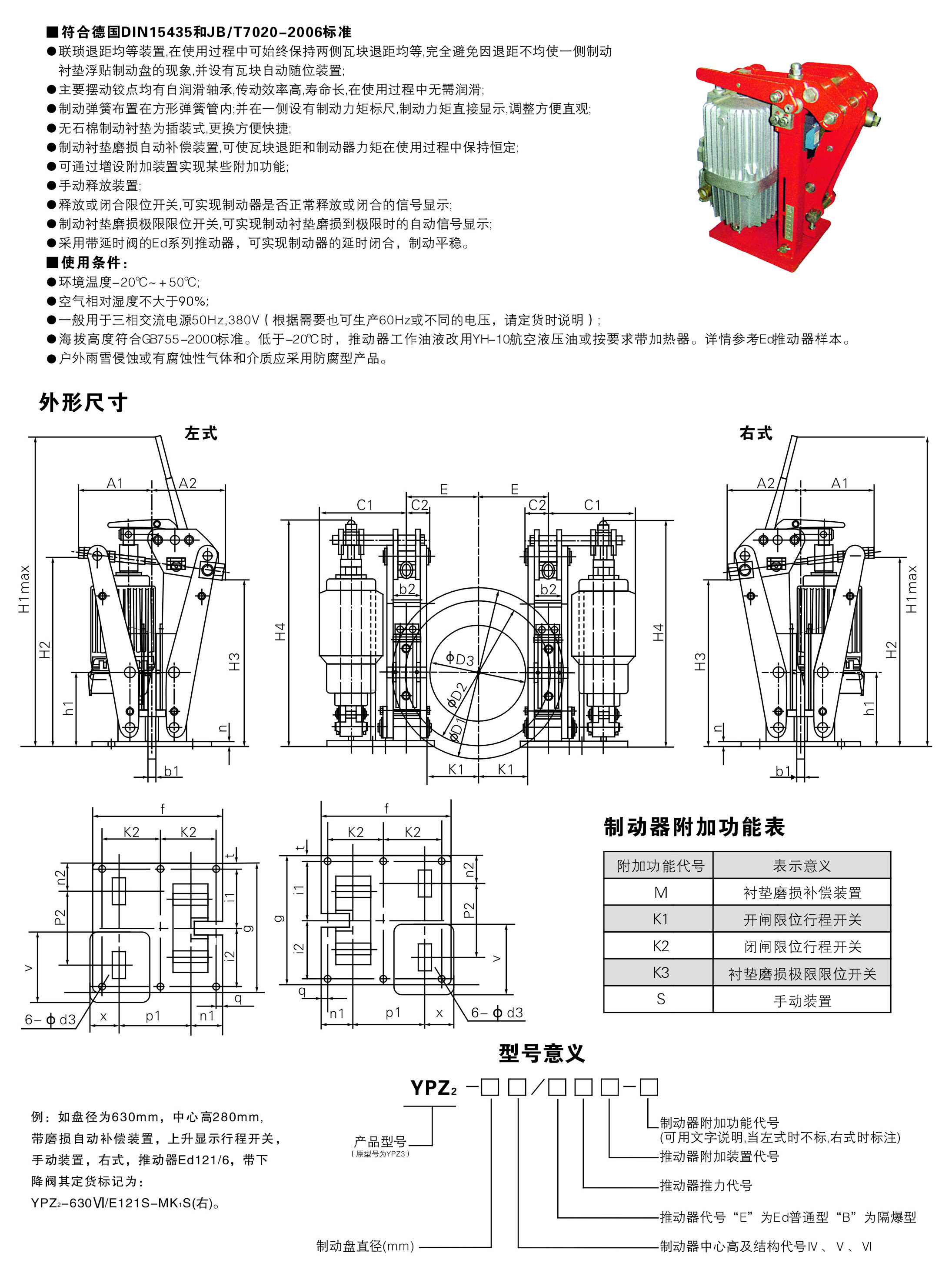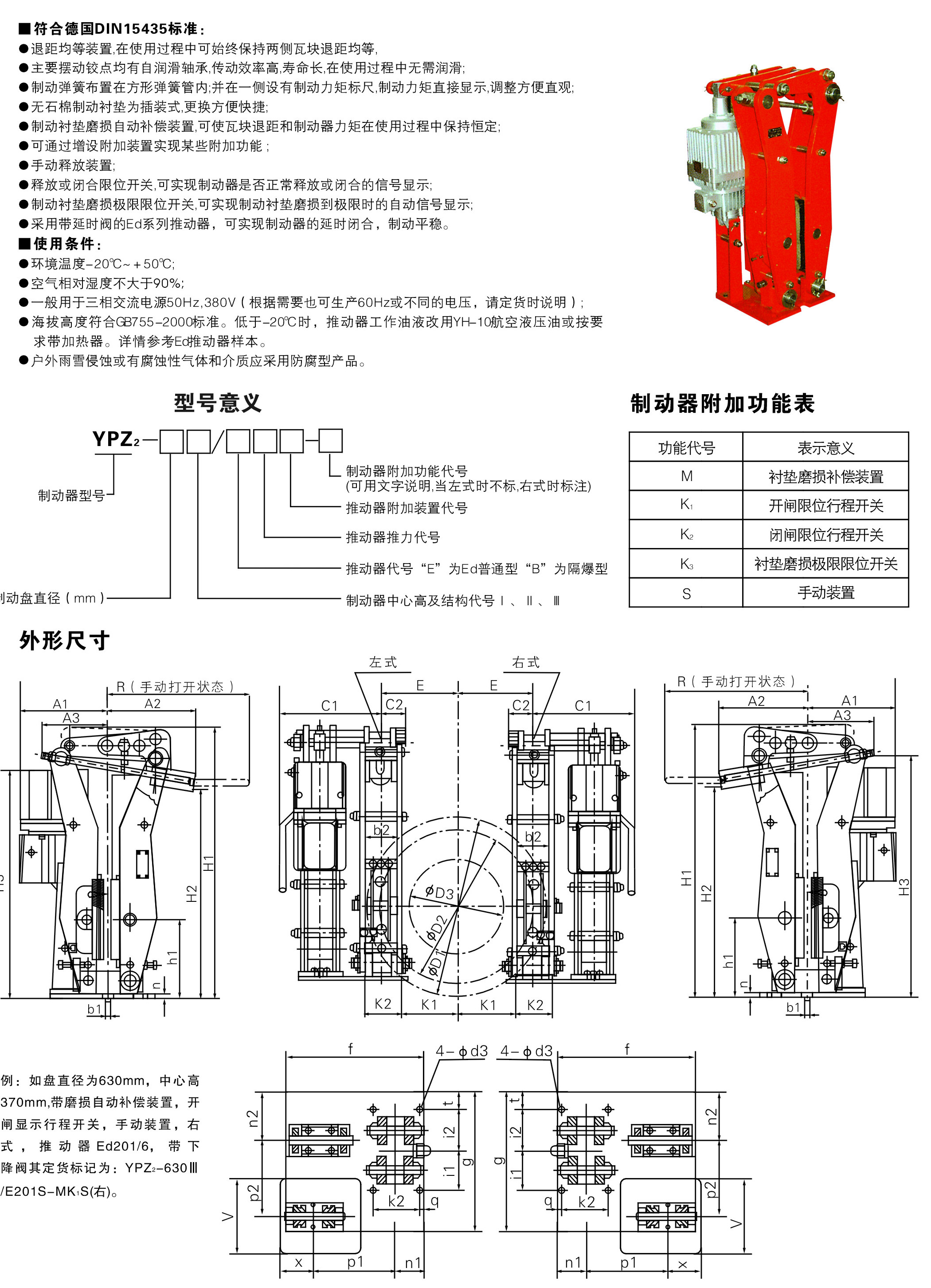 主要特點(diǎn):YPZ2 Ⅰ、Ⅱ、Ⅲ退距均等裝置,在使用過程中可始終保持兩側(cè)瓦塊退距均等; YPZ2 Ⅳ、V、Ⅵ聯(lián)鎖退距均等裝置,在使用過程中可始終保持兩側(cè)瓦塊退距均等,完全避免因退距不均使一側(cè)制動(dòng)襯墊浮貼制動(dòng)盤的現(xiàn)象,并設(shè)有瓦塊自動(dòng)隨位裝置。主要擺動(dòng)絞點(diǎn)均安裝有自潤滑軸承,傳動(dòng)效率高壽命長,在使用過程中無需潤滑; 制動(dòng)彈簧布置在方形彈簧管內(nèi);并在一側(cè)設(shè)有制動(dòng)力矩標(biāo)尺,制動(dòng)力矩直接顯示調(diào)整方便直觀; 無石棉制動(dòng)襯墊為插裝方式,更換方便快捷。 制動(dòng)襯墊磨損自動(dòng)補(bǔ)償裝置,可使瓦塊退距和制動(dòng)器力矩在使用過程中保持恒定; 可通過增設(shè)附加裝置實(shí)現(xiàn)某些附加功能; 手動(dòng)釋放裝置; 釋放和閉合限位開關(guān),可實(shí)現(xiàn)制動(dòng)器是否正常釋放或閉合信號(hào)顯示; 制動(dòng)襯墊磨損極限限位開關(guān),可實(shí)現(xiàn)制動(dòng)襯墊磨損到極限時(shí)的制動(dòng)信號(hào)顯示; 采用延時(shí)閥的Ed 系列推動(dòng)器,可實(shí)現(xiàn)制動(dòng)器的延時(shí)閉合,制動(dòng)平穩(wěn)。
