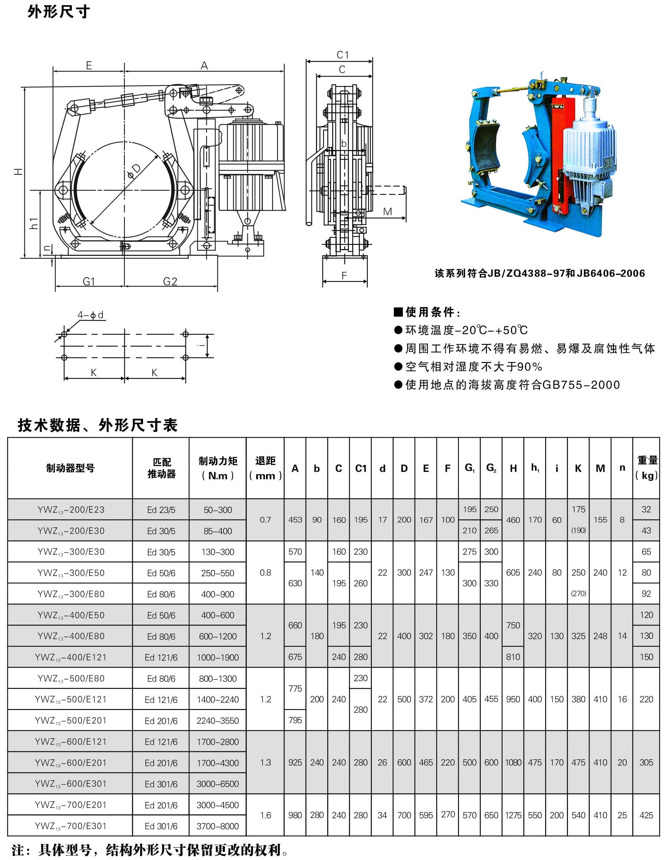 制動器安裝尺寸和制動力矩參數(shù):JB/ZQ4388-97標(biāo)準(zhǔn),技術(shù)要求符合JB/T6406-2006標(biāo)準(zhǔn)。